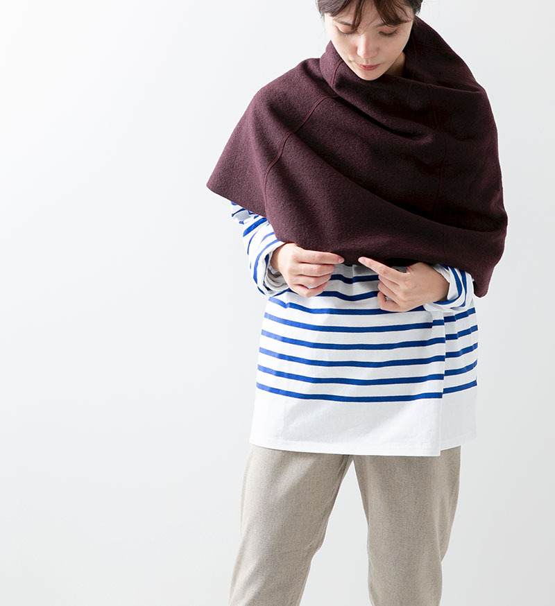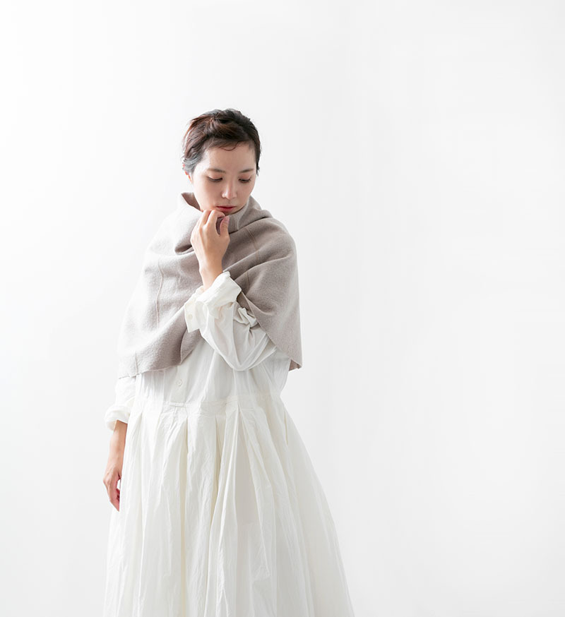 軽くて暖かいポンチョをお作り致しました。ウールリング素材に圧縮をかけた、密度のある独特の風合いが魅力です。肌に触れても、チクチク感はありません。薄手でかさばらず、気軽に着用して頂けます。