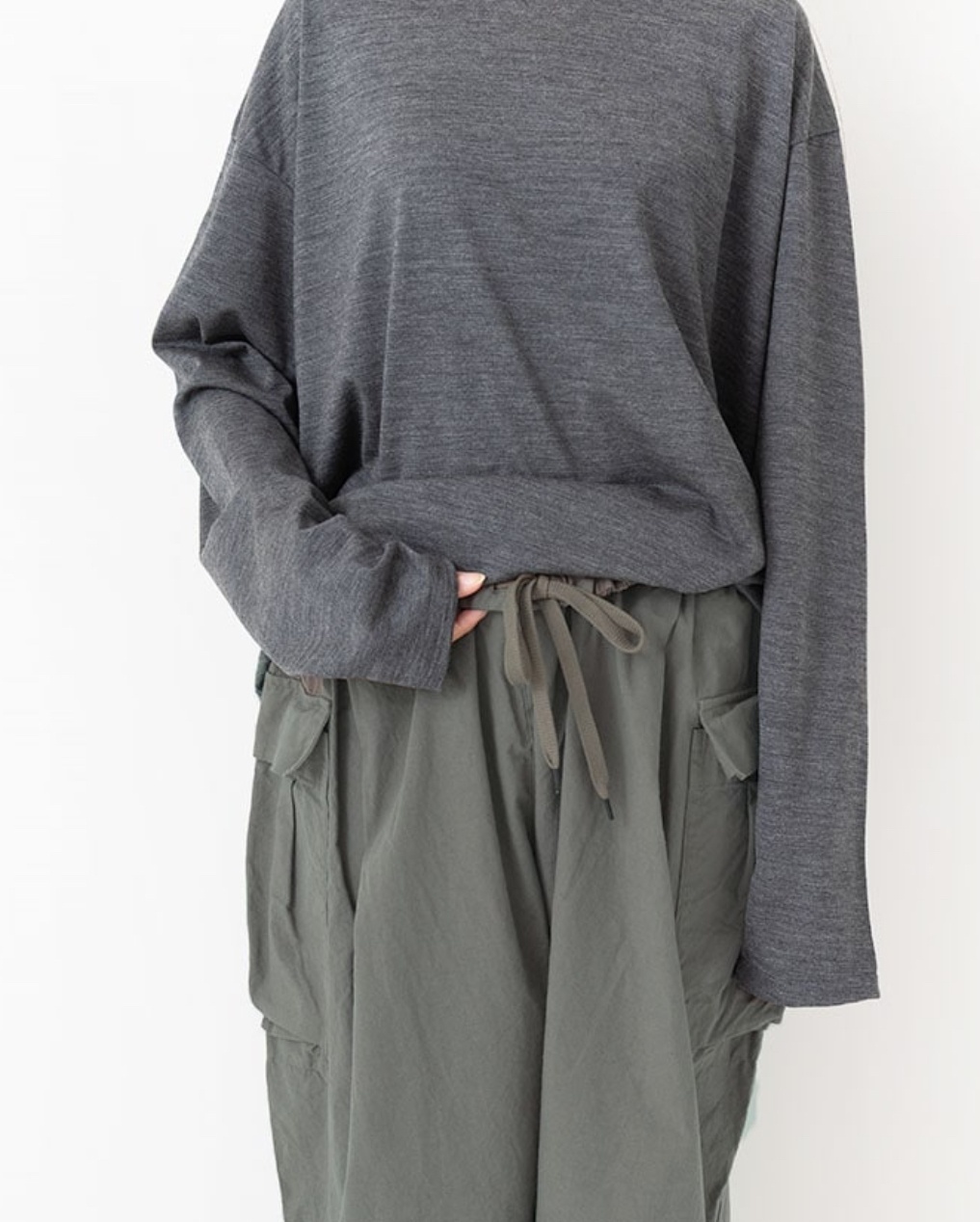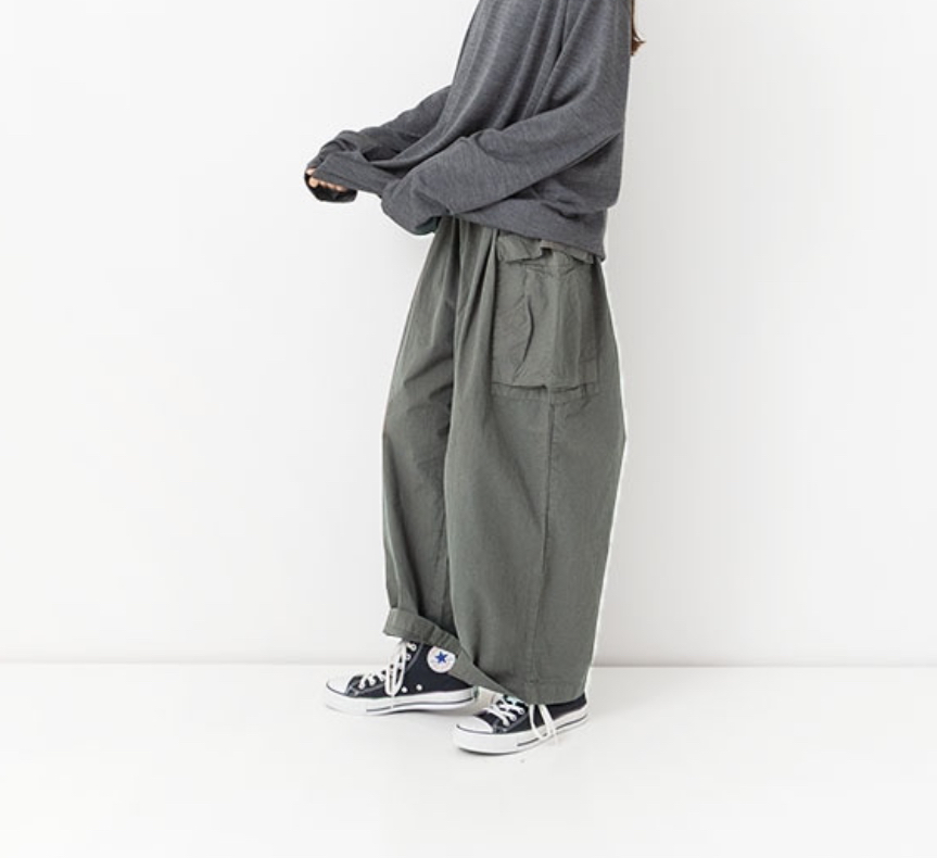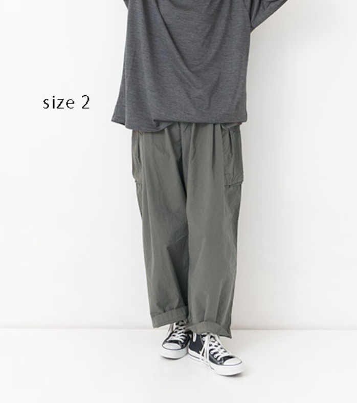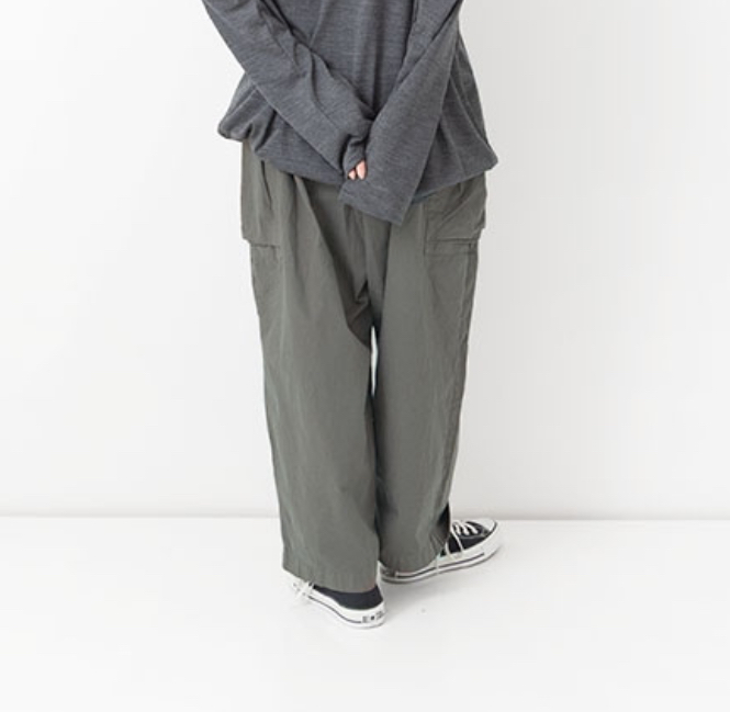 ミリタリーのカーゴパンツをベースに、イージースタイルに落とし込んだパンツ。脇にフラップ付きのポケットが付いたボリュームのあるワイドテーパードシルエット。やや短めの着丈でデイリーに着用しやすいバランスに仕上げています。ユニセックスの 2 サイズ展開です。