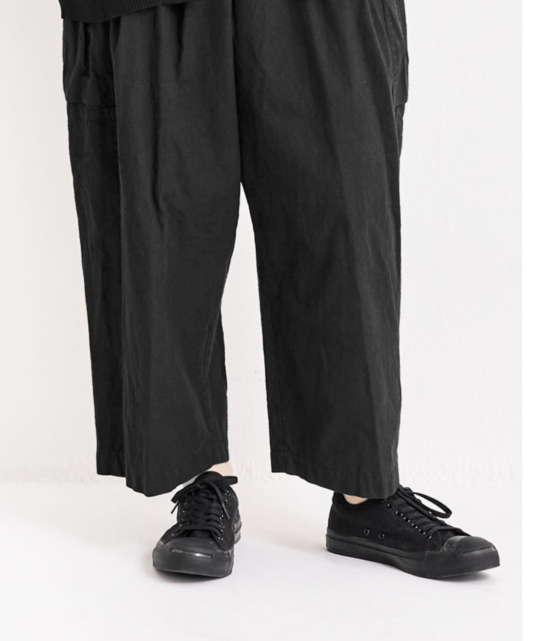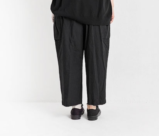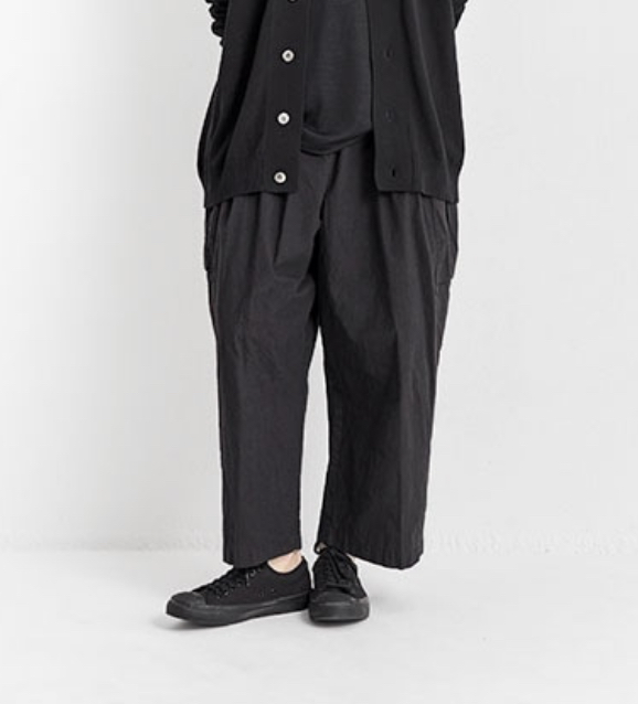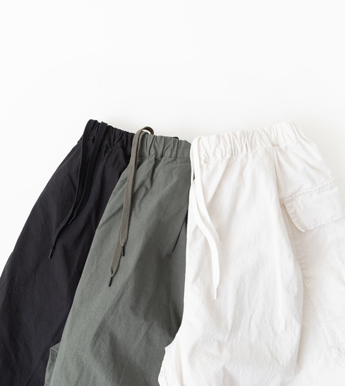 ミリタリーのカーゴパンツをベースに、イージースタイルに落とし込んだパンツ。脇にフラップ付きのポケットが付いたボリュームのあるワイドテーパードシルエット。やや短めの着丈でデイリーに着用しやすいバランスに仕上げています。ユニセックスの 2 サイズ展開です。