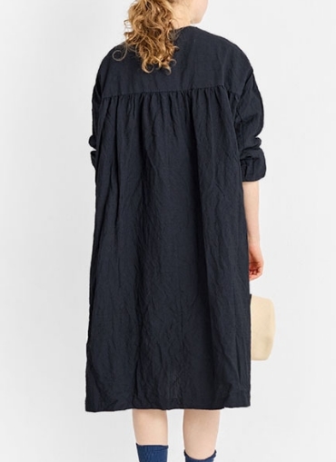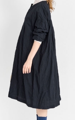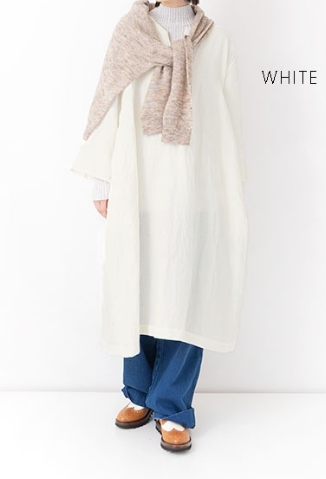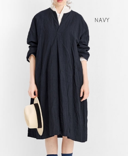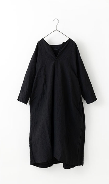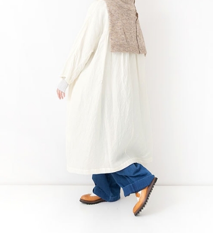 スキッパー仕様の前開きでリラックスした雰囲気のワンピース。前身頃はすっきりとしたシャツスリーブ、後ろがギャザーの入ったヨークスリーブになっており、前後で異なる印象がたのしめます。