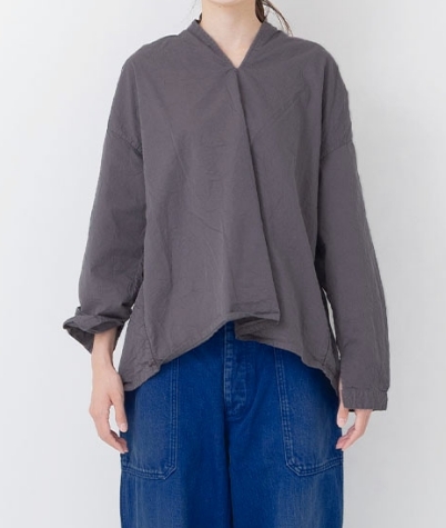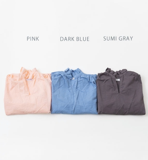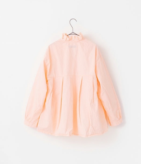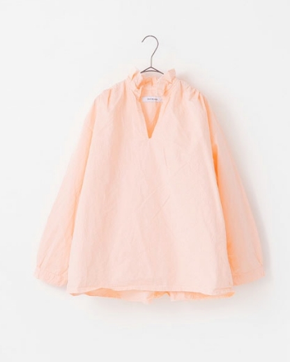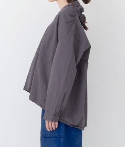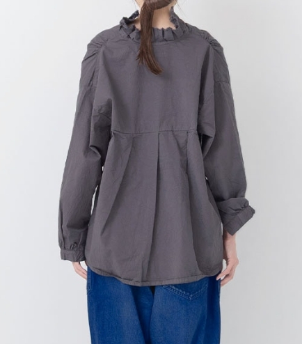 タックフリルを寄せたスタンドカラーが特徴的なブラウス。身頃にも随所にタックやギャザーが寄せられ、ふんわりとした A ラインのシルエットになっています。フェミニンなデザインにカジュアルな素材を合わせバランスを取った 1 着。コーディネートに色どりを加える 3 色展開です。