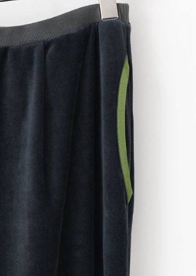 ウエストはタック、ゴムとヒモのシャーリング仕様です。脇のポケット口と裾に配色のパイピングを施しています。インナーパンツとしてもバランスをお楽しみいただけます。
