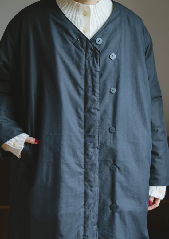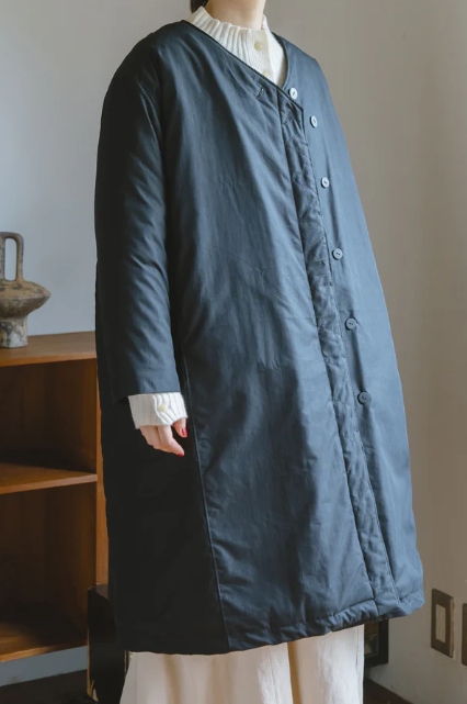 - ナチュラル感のある中綿コートは、表地にコットンナイロン・裏地はポリエステルを採用。内側のみキルトステッチを入れました。縦に入った多面切替と深すぎないVネックですっきりと◎前端のジグザクステッチもポイント◎総裏・前PK付