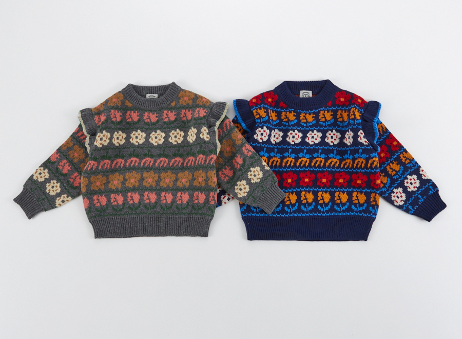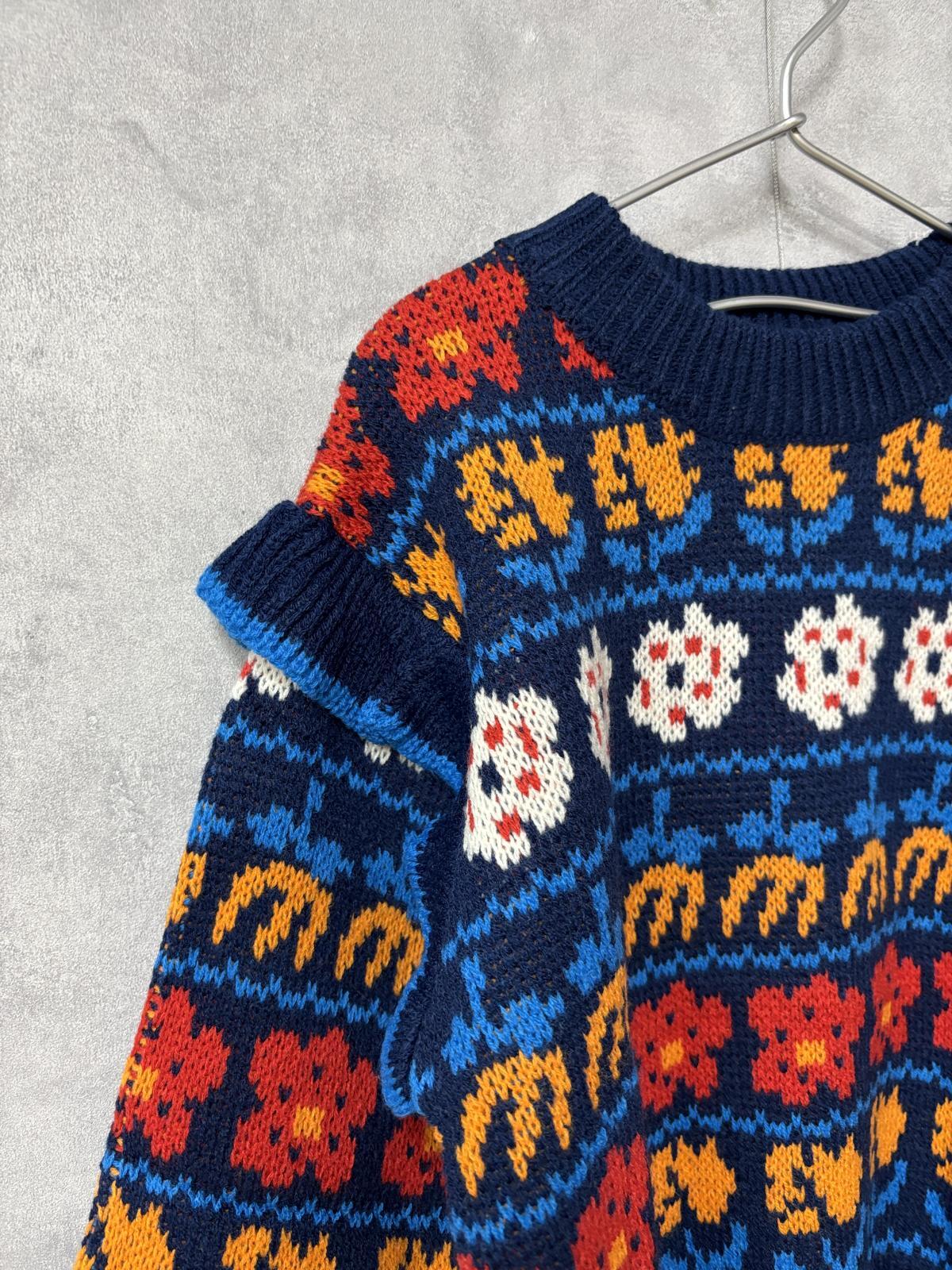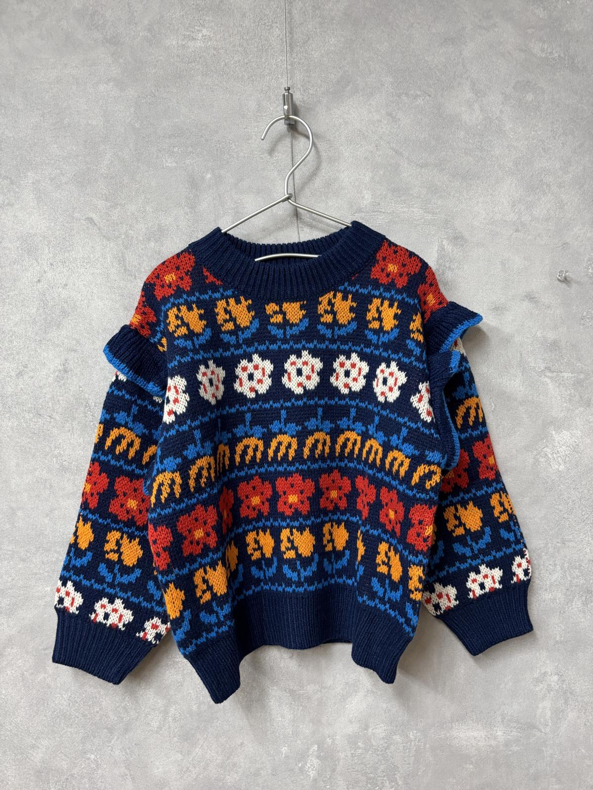 ・レトロな花柄が可愛い、ニットセーター。 ・肩のフリルがときめきポイント。 ・マシンウォッシャブル対応でお手入れ簡単。