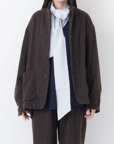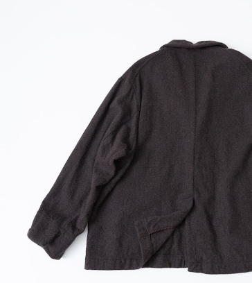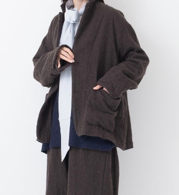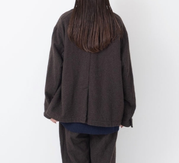 フラノ生地に縮絨加工とタンブラー加工を加え、ソフトで暖かみのある風合いに仕上げたウール素材です。肌に沿うようなふんわりとした柔らかな風合いで、リラックスした着心地が魅力です。
