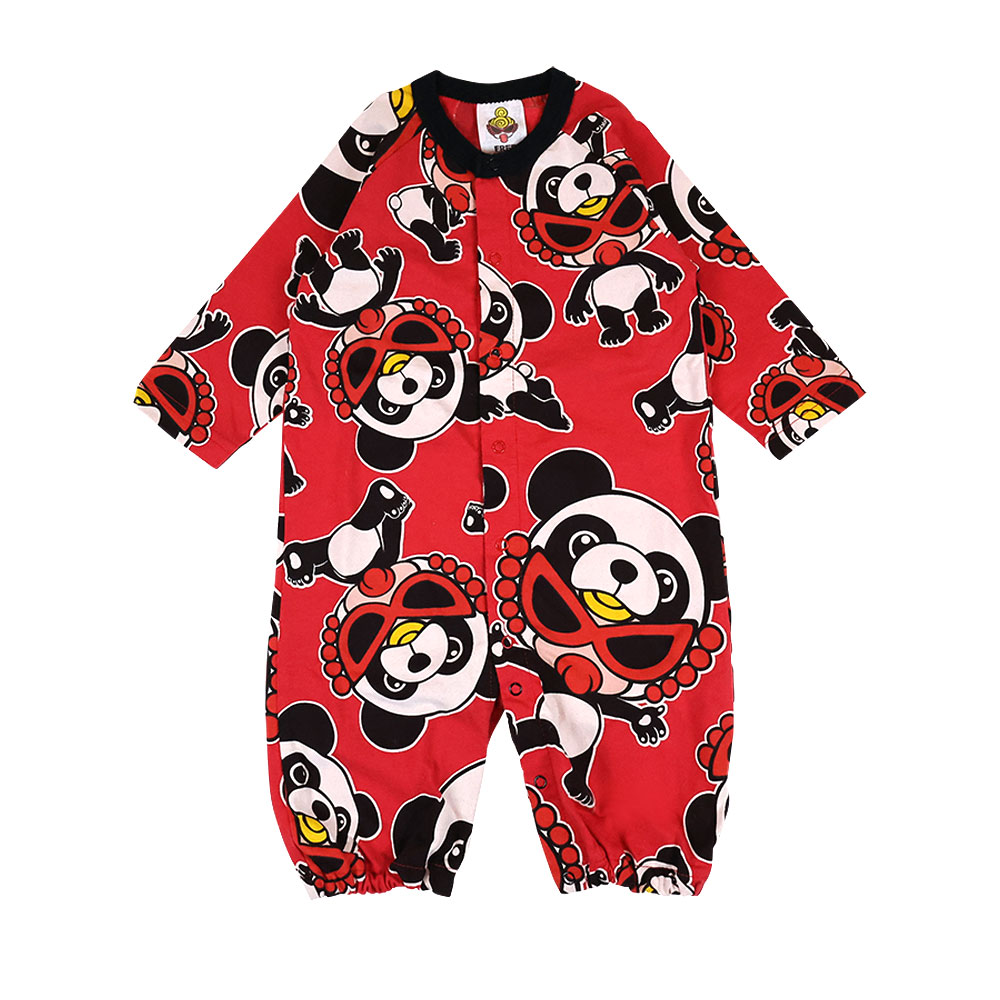 コロンとしたフォルムが可愛らしいPANDA MANIA総柄の2WAYALL☆首元はスッキリ単色のリブがついています。新生児から長く着れる2WAYALLは寝かせながらもお着換えができるのでギフトにお勧めです。PANDA MANIA定番のホワイトやブラックはもちろん、差し色になるレッドも実はお勧めです。足元のボタンのカラーが切り替わる箇所で留め変えてもらえればドレススタイル、パンツスタイルと着回しができます。