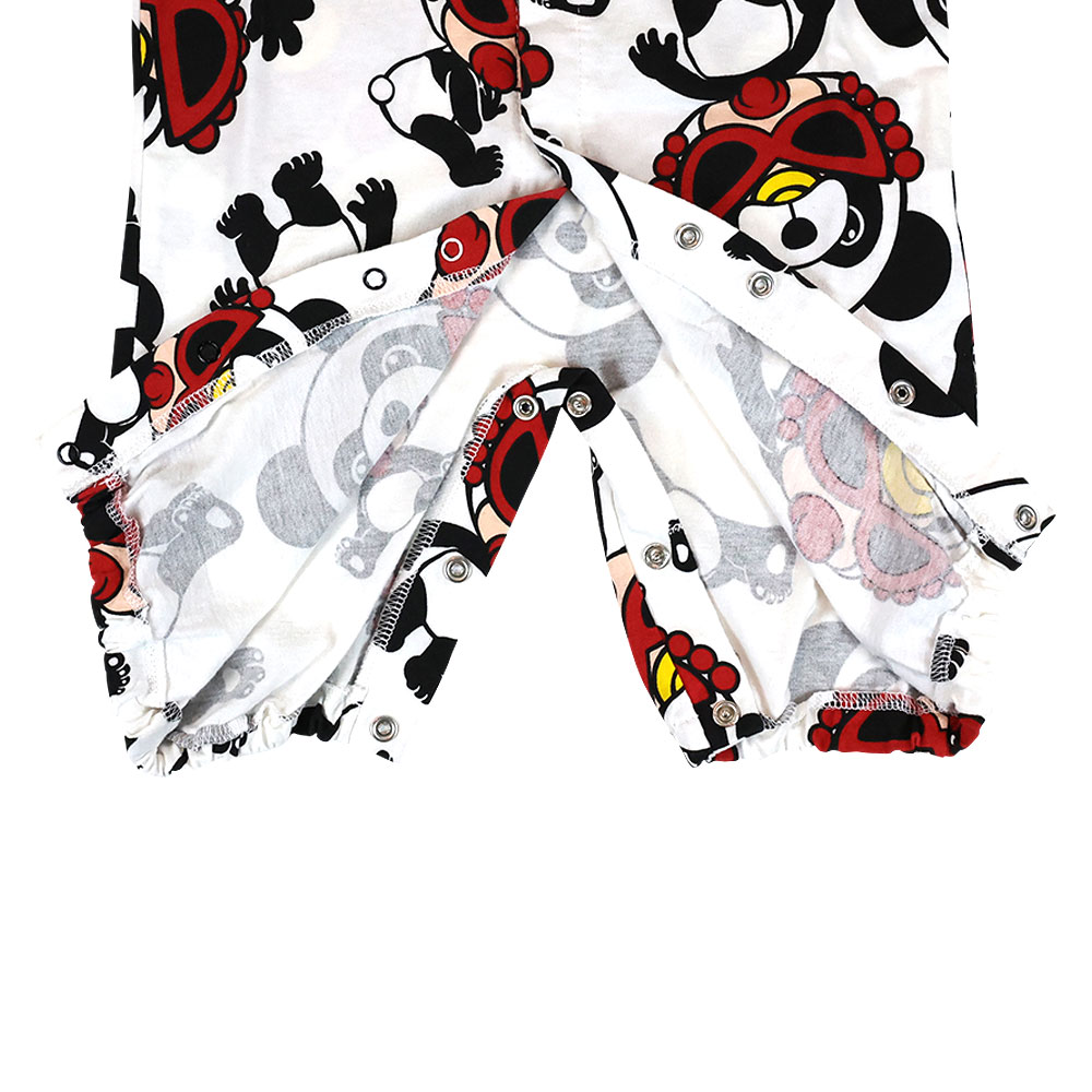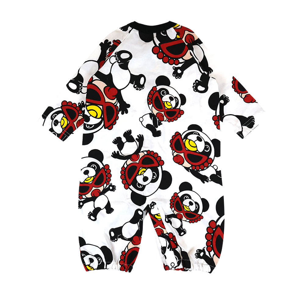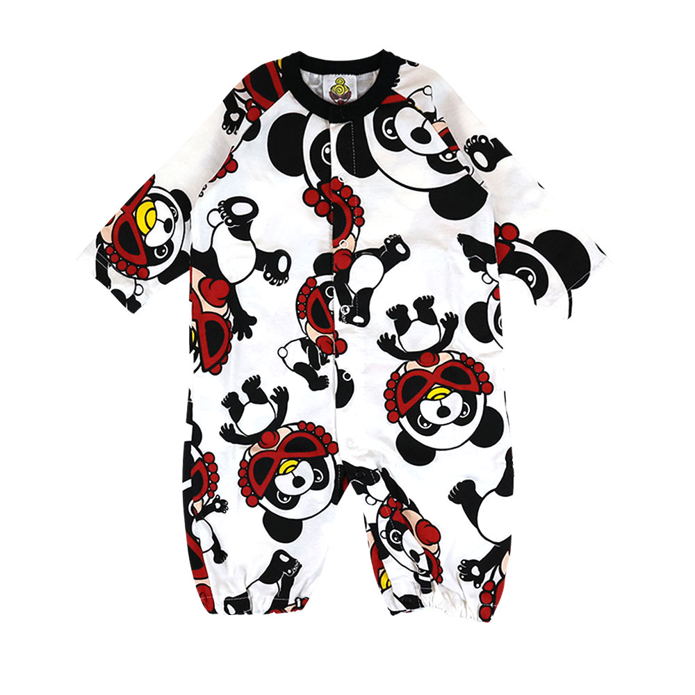 コロンとしたフォルムが可愛らしいPANDA MANIA総柄の2WAYALL☆首元はスッキリ単色のリブがついています。新生児から長く着れる2WAYALLは寝かせながらもお着換えができるのでギフトにお勧めです。PANDA MANIA定番のホワイトやブラックはもちろん、差し色になるレッドも実はお勧めです。足元のボタンのカラーが切り替わる箇所で留め変えてもらえればドレススタイル、パンツスタイルと着回しができます。