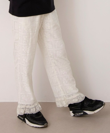 1枚あれば今春のトレンドをしっかり押さえたも同然の総レースンのワイドパンツ。