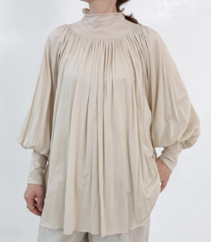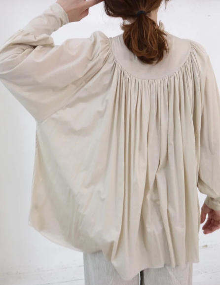- 滑らかさとシャリ感を持つエアリーなコットン地をふんだんに使用したギャザーブラウス。カットソー仕立てなので伸縮性もあり着心地の良い一枚。袖口をたくし上げボリュームを持たせるとぐっとクラシカルな雰囲気に。日常からオケージョンシーンまでマルチにお使いいただけます。