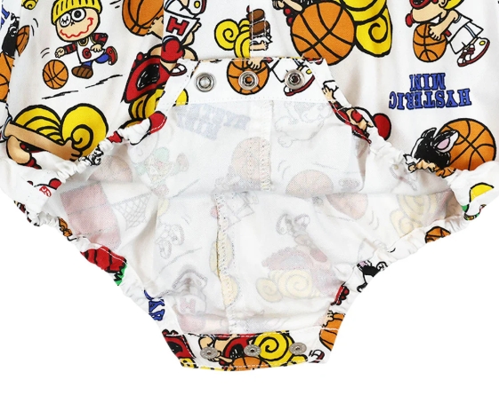 綿オックスのしっかりとした生地感で仕上げたHYSTERIC HOOPS総柄のサロペットは肩ひも部分にボタンが縦に2つ付いているので着丈の調節も可能です。適度な密度と強度がありしわもつきにくい素材ですが通気性もあるので着心地もGOOD☆グラフィックの色味もキレイでコーデの主役になること間違いなしな1枚です。