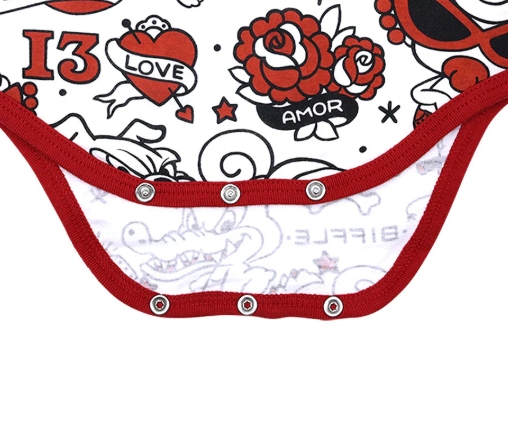 COOLでかっこいいTATTOO PARLOURのクラシックな総柄が半袖ロンパースになって登場☆ふっくらソフトに仕上がった綿でデリケートなベビーちゃんのお肌を守ってね♪