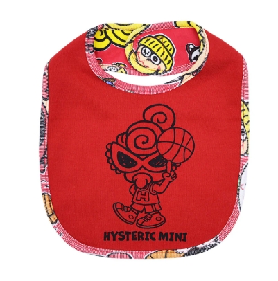 MINIちゃんと愉快な仲間たちがアクティブにバスケットボールをプレイする姿が可愛らしいHYSTERIC MINI HOOPSのリバーシブルスタイです。その日の気分によって着用面を選べるリバーシブルスタイはギフトにもお勧めです。マジックテープで簡単に着脱可能、日々スタイを使用するベビーちゃんのマストアイテムです。