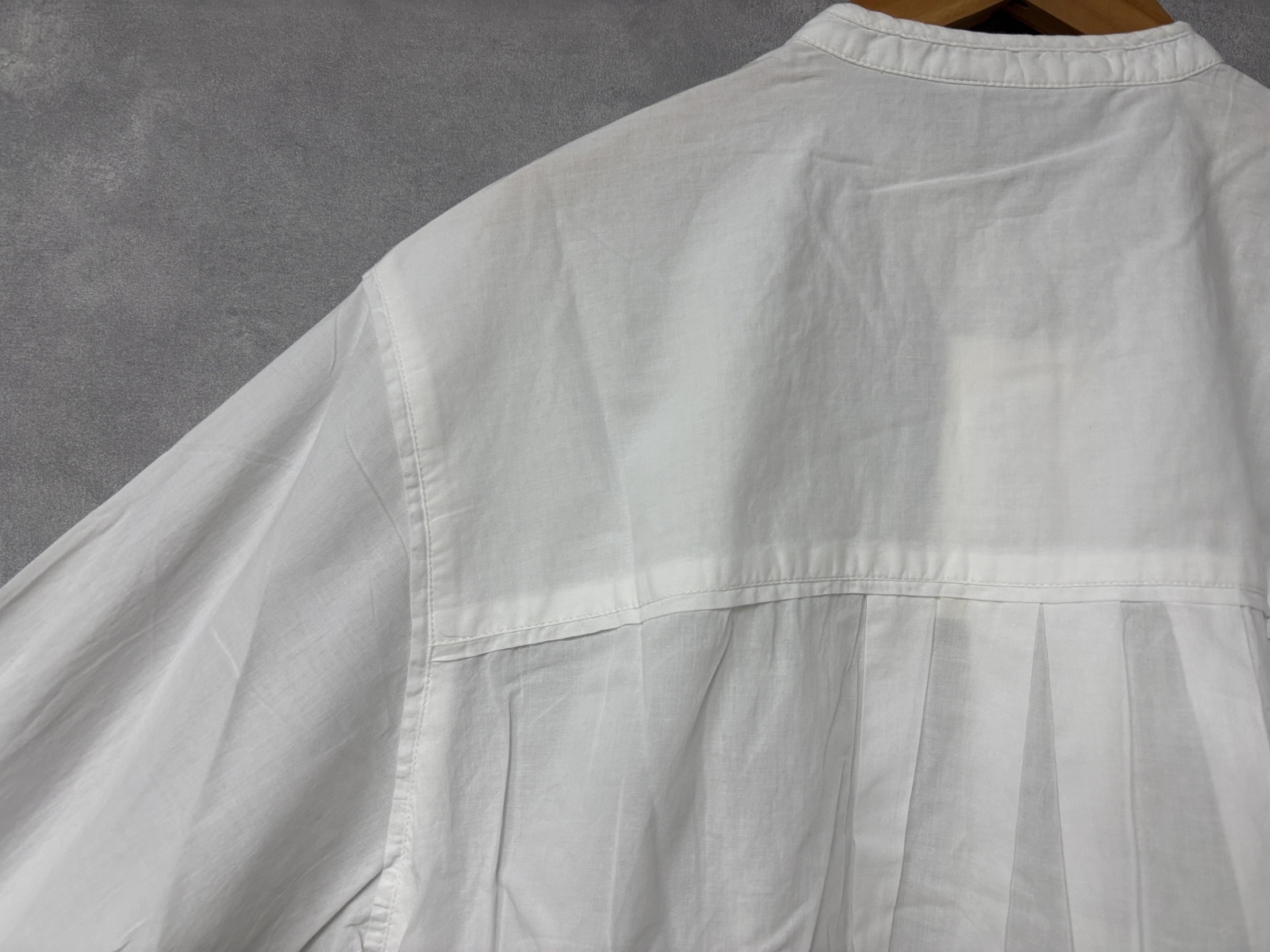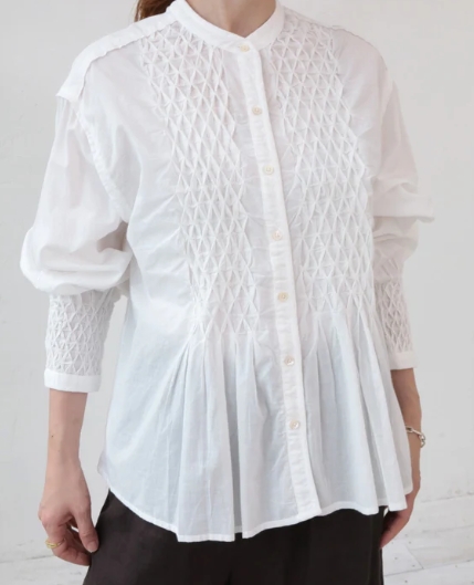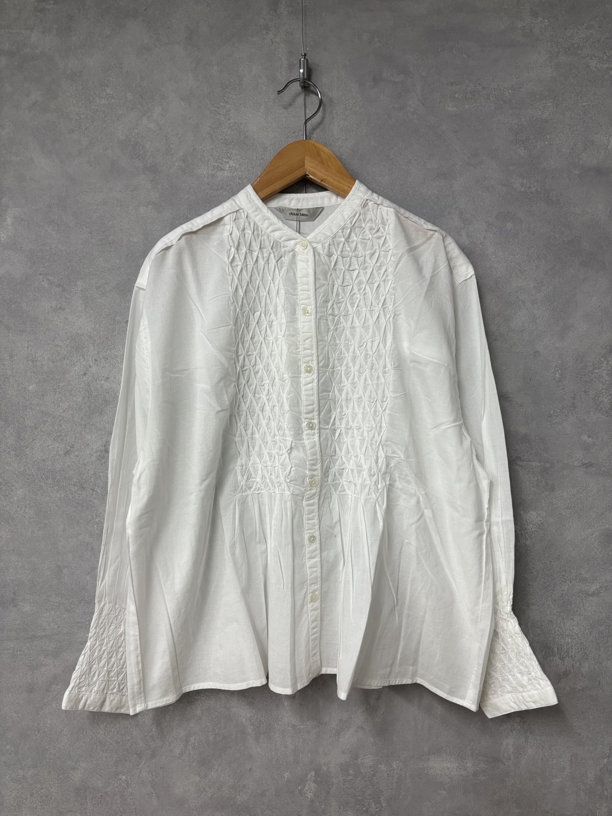 一針一針丁寧に施された、立体的で繊細なスモッキング刺繍が印象的なスタンドカラーシャツ。しなやかでやわらかな透け感のあるインド綿ボイル素材を使用し、風をまとうような軽やかさと心地よさを実現。インナーにも一枚着にも映える、完成度の高い一着です。