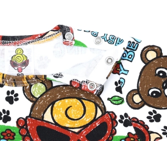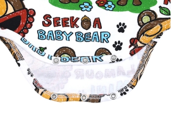 BABY BEARはどこに行ったの?SELFISH BABYなMINIちゃんがBABY BEARを探しに足跡を追って行く姿が可愛らしい総柄のロンパースです。首が座ってくる3ヶ月以降のベビーちゃんがサイズのお目安のロンパースはギフトにもお勧めなウェアアイテム♪柔らかなお肌に優しい素材でベビーちゃんのお洒落を楽しんじゃお☆