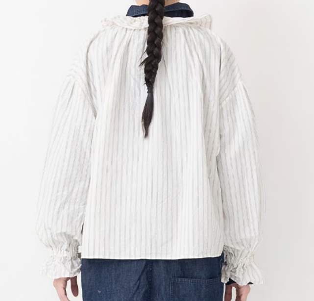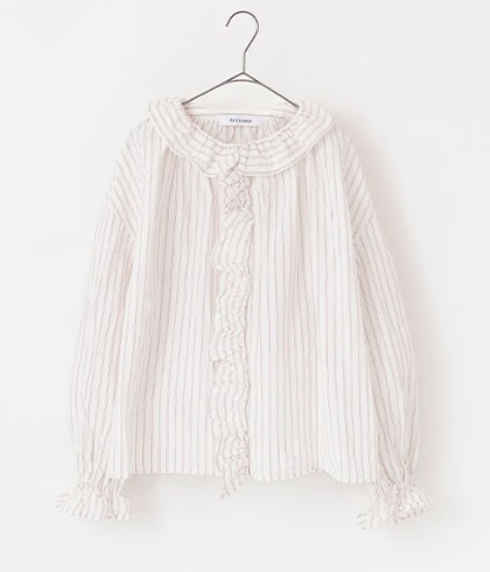 衿ぐりから前端に掛けて寄せられたフリルが特徴的なブラウスです。