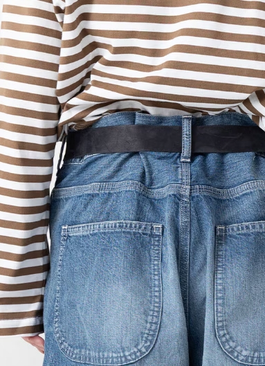 程よい厚みのある 9.5 オンスのムラ糸デニム素材です。たて糸は USA コットンをメインに使用。すっきりとした表情を表現するために繊維を揃えるカーディングの工程を 2 回行い、糸の強度と光沢が出るように仕上げています。