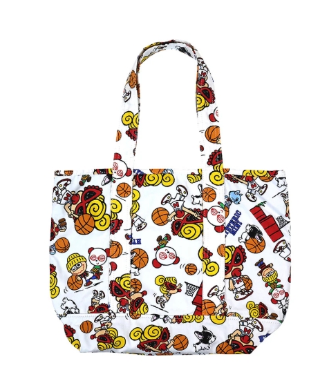 お子様から大人の方まで使いやすいサイズ感の横長トートバッグはしっかりとした綿オックス素材で仕上がっています。MINIちゃんと仲間たちがバスケットボールを楽し気にプレイするHYSTERIC HOOPS総柄のカラフルポップなグラフィックも鮮明に再現され、遊び心あるデザインになっています。