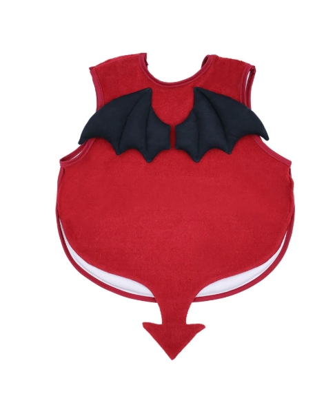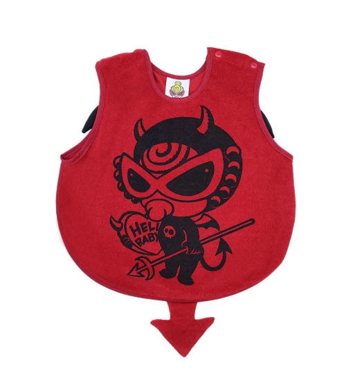 立体的なDEVILKINの羽の付いたパイル地のお食事エプロンです。柔らかな素材感にしっぽもプラスされて可愛さもUP☆肩部分にボタンが付いているので着脱も簡単です。フロントのハートを抱えたぷっくりDEVILKINにも注目☆