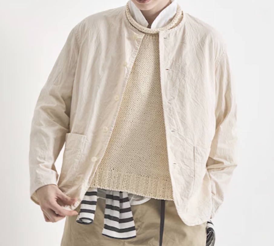 すっきりとした衿ぐりのノーカラージャケット。身頃にゆとりを持たせたボックスシルエットです。洗いざらしの似合うカジュアルな素材で、デイリーに着用できる 1 着。